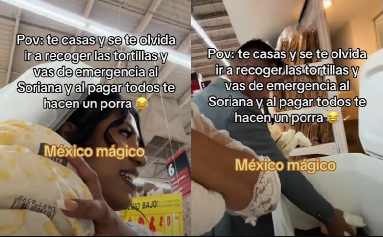 La escena fue compartida por la usuaria @karlaesquivel420, quien documentó el curioso episodio que marcó su boda. En el clip se puede leer: «POV: Te casas y se te olvida ir a recoger las tortillas y vas de emergencia al Soriana y al pagar todos te hacen una porra». En las imágenes se observa a Karla, vestida de blanco, acompañada de su esposo con traje formal, mientras recorren el supermercado en busca del esencial acompañamiento para la cena.