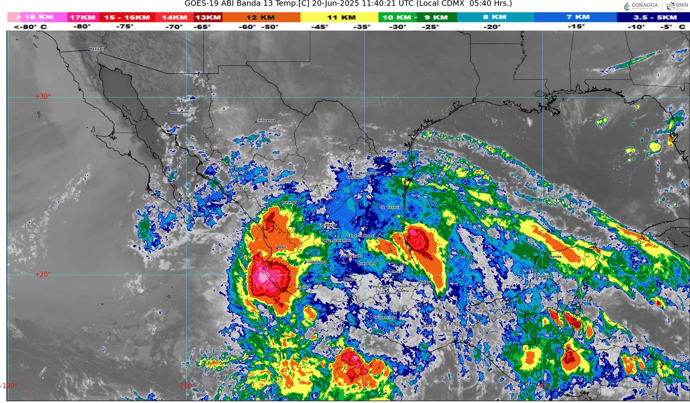 Además, el patrón de circulación tipo monzón mexicano continuará afectando el noroeste del país, con lluvias fuertes a muy fuertes, descargas eléctricas y posibles granizadas en esa región. Se pronostican lluvias puntuales intensas en Chihuahua, Durango, Sinaloa y Nayarit.