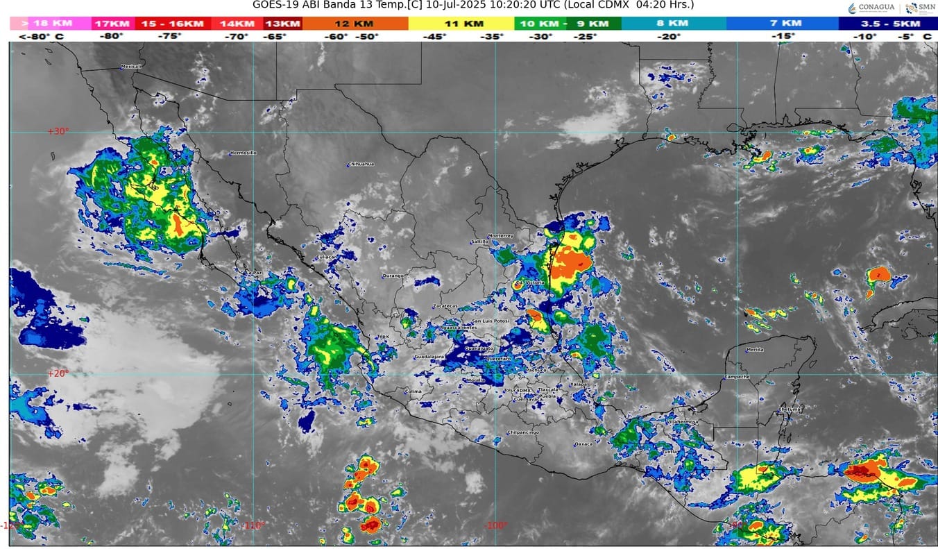 La onda tropical número 10 que se desplazará sobre el occidente de México, generará lluvias puntuales fuertes en Michoacán, Colima y Jalisco. Otro canal de baja presión en el sureste mexicano, en combinación con el ingreso de aire húmedo del golfo de México y mar Caribe, propiciará lluvias puntuales fuertes en Chiapas y chubascos en Tabasco.